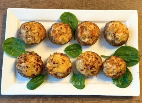 В оставшуюся часть начинки добавляется немного консервированного ананаса, чтобы создать интересное сочетание вкусов. Остальные грибы фаршируются этой смесью и запекаются в аэрогриле при 190 °C в течение 15 минут (в духовке может уйти чуть больше времени).