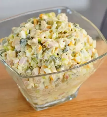 Для приготовления нарезать лук-порей и ошпарить его кипятком. Яйца сварить, очистить и также нарезать. Остальные ингредиенты, такие как ветчина и огурцы, следует нарезать кубиками. Смешать все в одной посуде, заправить соусом из йогурта, чеснока и майонеза, посолить и поперчить по желанию.