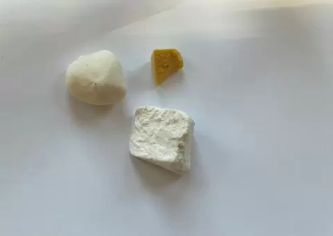 Для создания картошки пригодится полупрозрачная белая запекаемая пластика и обычная белая глина. Эти материалы понадобятся в равных пропорциях, а также потребуется небольшой кусочек пластики песочного цвета. Например, для работы могут использоваться цернит полупрозрачного цвета и обычная белая глина, а также песочная артефакт.