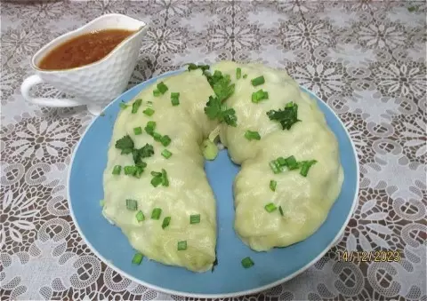 Приготовление начинается с теста. В глубокой миске смешать муку с солью, затем добавить кипяток и растительное масло. Замесить, чтобы тесто стало эластичным и не прилипало к рукам. Завернуть его в пленку и оставить на некоторое время для отдыха.