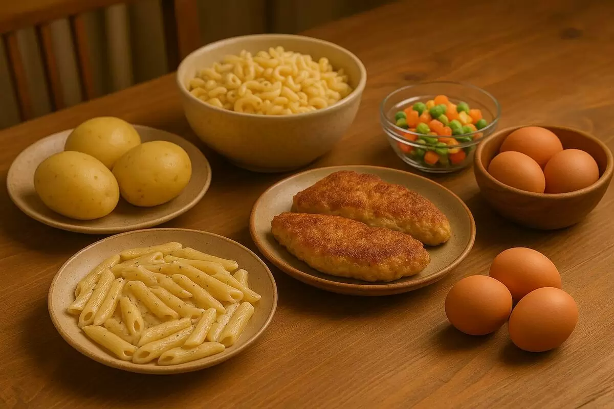 - Картофель: Этот продукт словно белая футболка — подходит ко всему. Его можно запечь, отварить, обжарить или сделать пюре. Популярными блюдами являются картофельные дольки с чесноком и «ленивый» суп с замороженными овощами.