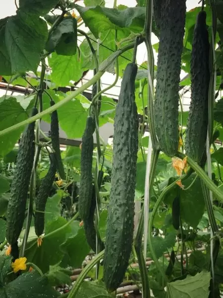Огурцы этот сорт выделяются своей длиной — от 35 до 40 см — и массой от 160 до 280 граммов. Они имеют удлиненно-цилиндрическую форму с яркой темно-зеленой окраской и небольшими светлыми полосками. Бугорчатая поверхность облегчает процесс сбора урожая и создает эффектный внешний вид.