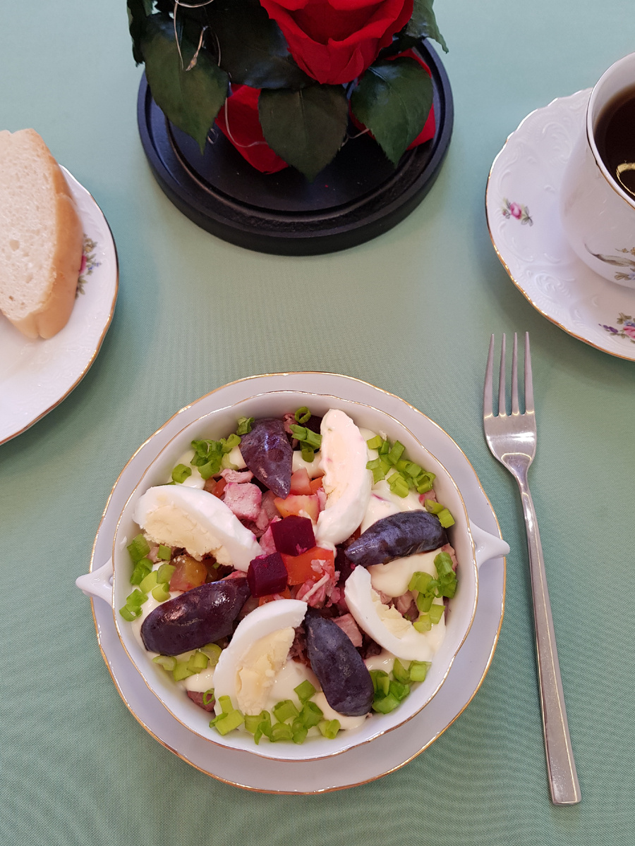 - Разложить смесь по салатникам и щедро полить майонезом.