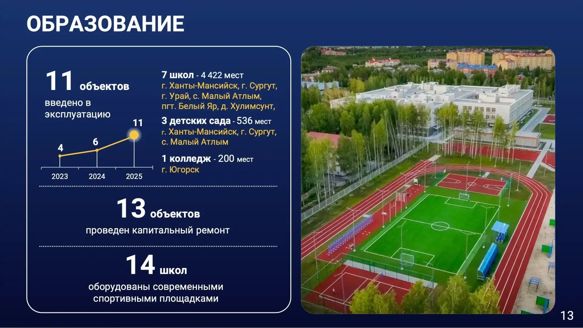 В 2025 году мы ввели в эксплуатацию 11 объектов образования. Это новые школы в Ханты-Мансийске, Сургуте, Урае, Сургутском, Березовском и Октябрьском районах, детские сады в Сургуте, Ханты-Мансийске и Октябрьском районе, а также колледж в Югорске.