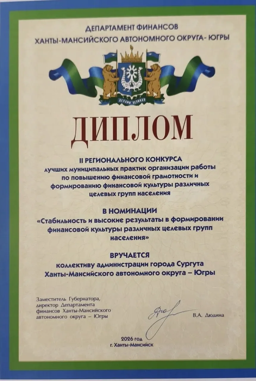 Администрацию Сургута отметили за высокие результаты в формировании финансовой культуры