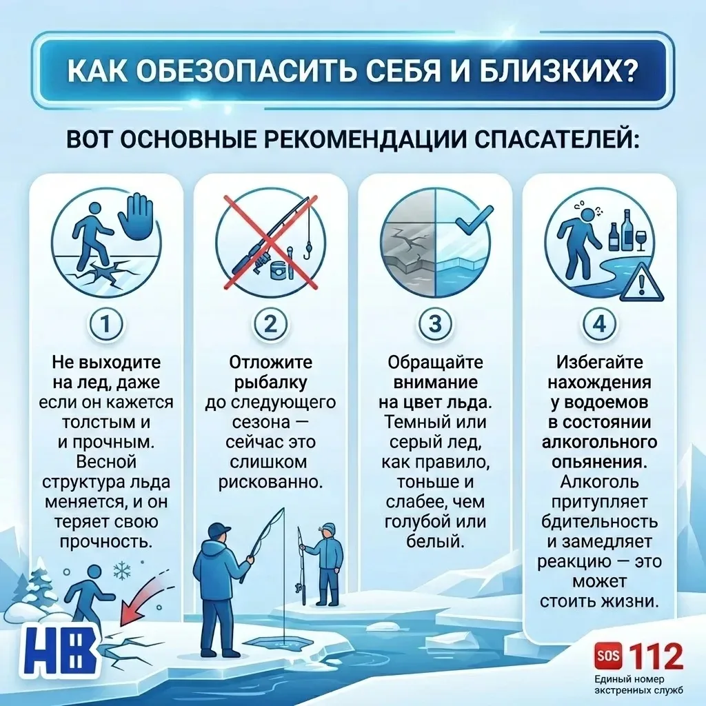 1. Не выходите на лед, даже если он кажется толстым и прочным. Весной структура льда меняется, и он теряет свою прочность.
