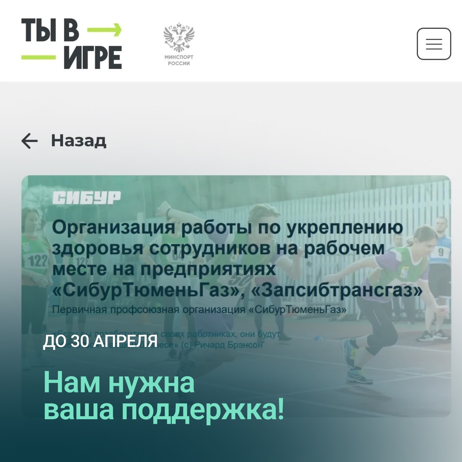 Первичная профсоюзная организация «СибурТюменьГаз» прошла в полуфинал (Топ-250 из 6000) и вошла в Топ-10 Всероссийского конкурса «Ты в игре» в номинации «Корпоративный спорт» с проектом «Минутка здоровья».