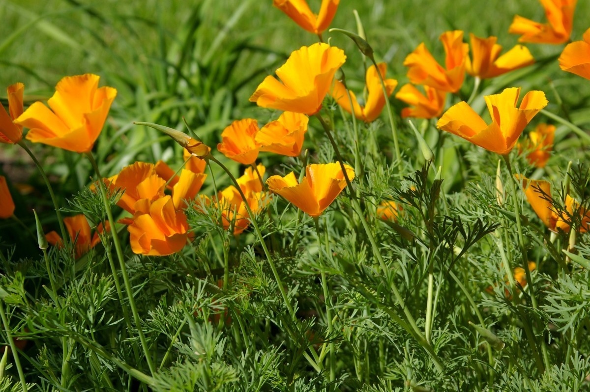 - Эшшольция калифорнийская – известная своим ярким, атласным цветением. Она достигает высоты 30 см и цветет с конца мая, радуя глаз цветами оранжевого и желтого оттенков.