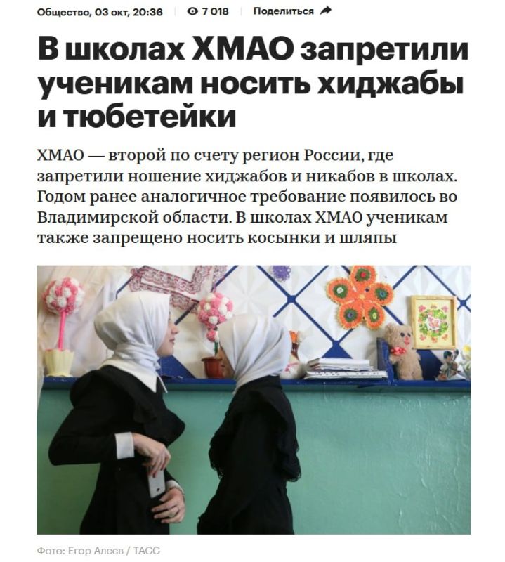 04.10.2025, 11:03 В школах Ханты-Мансийского автономного округа запретили носить головные уборы, включая хиджабы и никабы. Запрет распространяется не только на религиозную одежду, но и на любые аксессуары на голове, в том числе косынки, тюбетейки и шляпы.// Раньше всех. Ну почти.